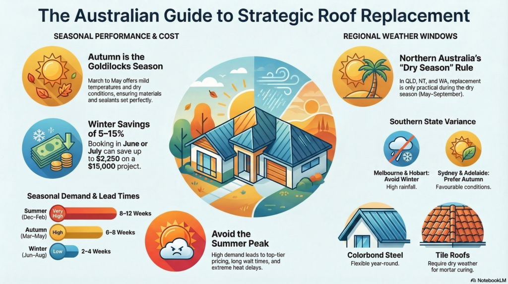 Autumn (March to May) is the best time of year to replace a roof for most Australians — mild weather, dry conditions, and a good run before winter. If saving money is your priority, winter (June to July) is the cheapest time, with potential savings of 5–15%. In northern Australia (QLD, NT), winter is the only practical option due to the wet season.